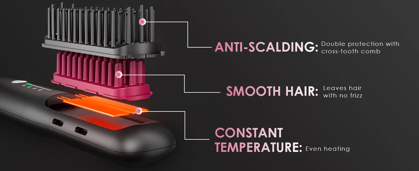 【Anti-Scald & Safe Double Tooth Comb Design】 Featuring a 2-tier tooth comb, Hot comb ensures safety and even heating. The outer teeth prevent burns to your face and skin, while the inner teeth protect your scalp. Safe for all ages! The cross-tooth design ensures consistent heat distribution for all-day styles