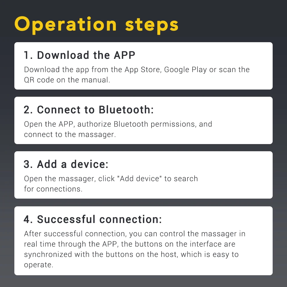 1. Our electric shoulder massager features dual control freedom-App or manual. For APP control, it is compatible with both Android and iOS, allowing you to manage multiple devices effortlessly. You can enjoy hands-free control via a Bluetooth-compatible connection. You can also manually operate the massage shoulder pad directly by pressing the touchscreen buttons.
